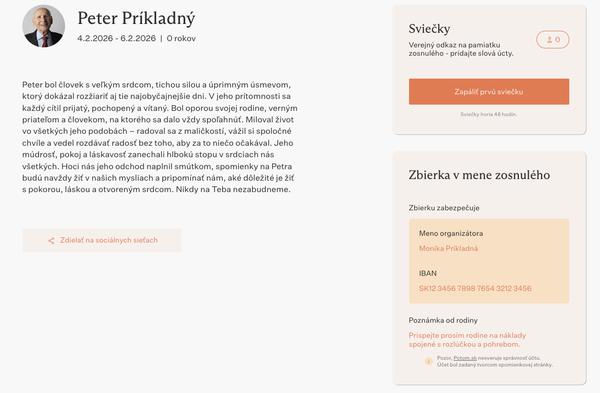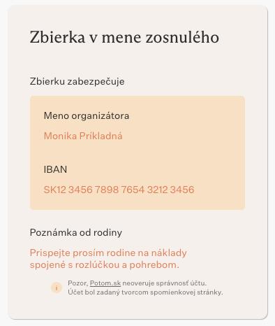 viete zadarmo vytvoriť "spomienkovú stránku" ktorú viete rozposlať rodine. Prečo to spomínam tu je, že okrem nejakých fotiek či popisov tam môžete otvoriť "Zbierku" pre rodinu. Ukáže sa tak všetkým odkaz / číslo účtu kam môžu priatelia a známy poslať peniaze na podporu - napr namiesto kvetov.