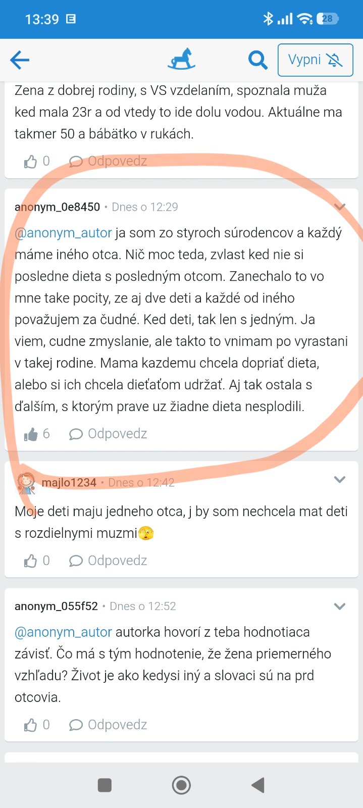 @anonym_autor ja som zo styroch súrodencov a každý máme iného otca. Nič moc teda, zvlast ked nie si posledne dieta s posledným otcom. Zanechalo to vo mne take pocity, ze aj dve deti a každé od iného považujem za čudné. Ked deti, tak len s jedným. Ja viem, cudne zmyslanie, ale takto to vnimam po vyrastani v takej rodine. Mama kazdemu chcela dopriať dieta, alebo si ich chcela dieťaťom udržať. Aj tak ostala s ďalším, s ktorým prave uz žiadne dieta nesplodili.