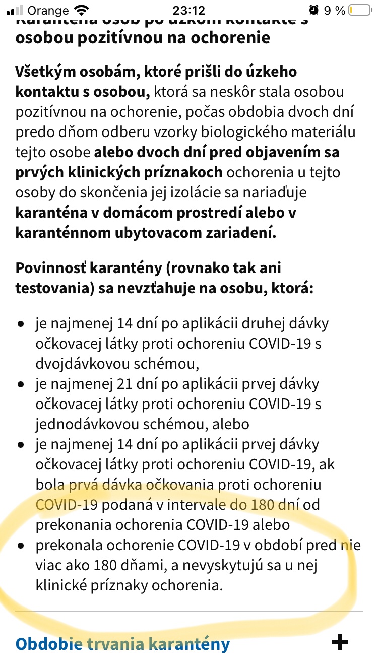 Jasne, že nemusí byť v karanténe, režim P- prekonaný, 180 dní od potvrdeného testu mástatus ako plne zaočkovaná osoba