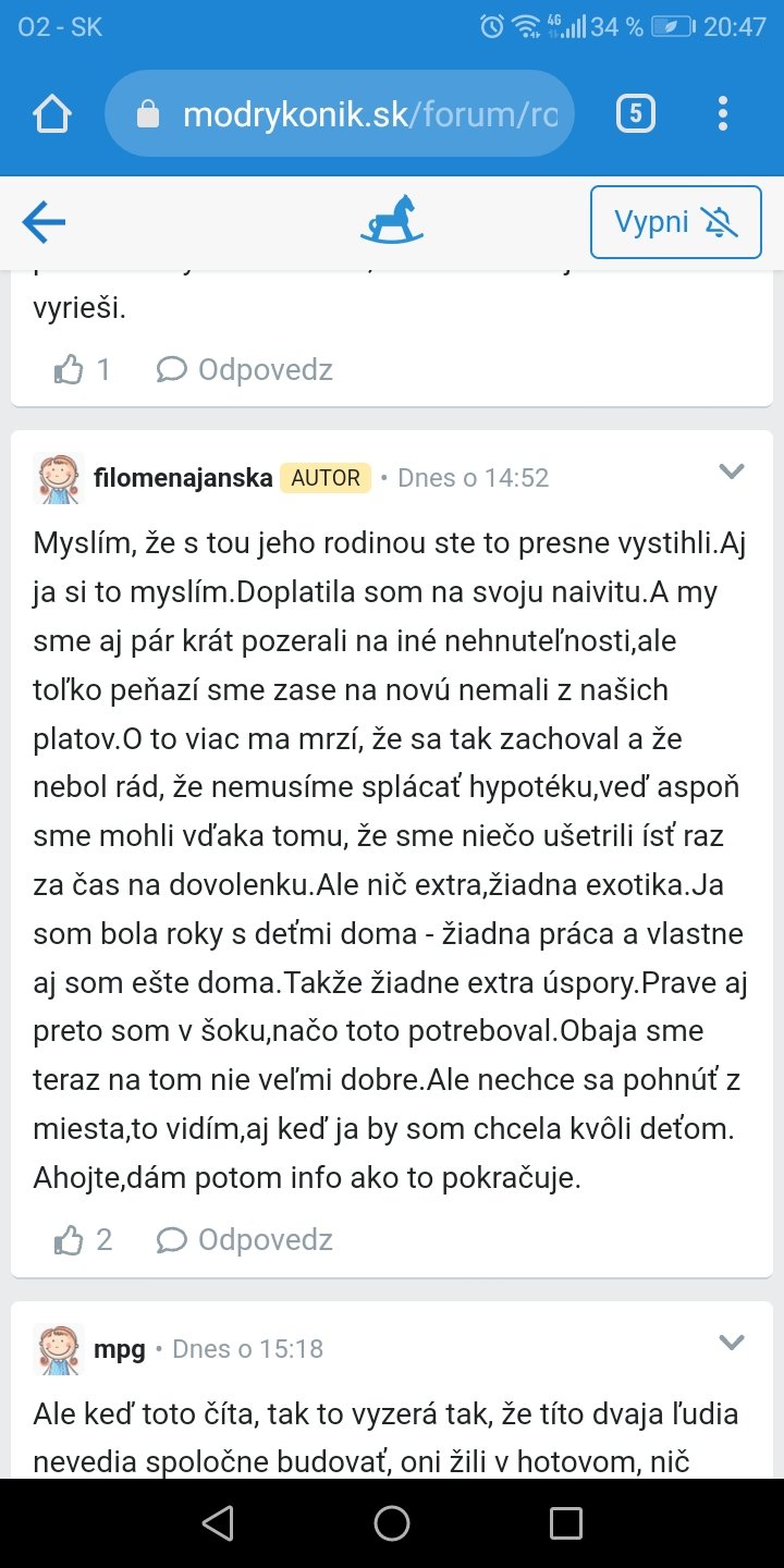 @filomenajanska nebrala by som mu kľúče, poslala by som mu list, že sa chcem stretnúť a doriešiť to. Čítala som tvoje ďalšie príspevky, vy ste ale boli pasívnymi obaja, nehnevaj sa. Nemuseli ste platiť hypo, nemuseli ste riešiť prerábku bytu, čo zhltne kopu financií a píšeš, že ste mali ledva na dovolenku. Viem, písala si, že si bola dlho doma, čiže ste žili len z jedného platu, nech už bol dôvod akýkoľvek, bolo to možno pre všetkých pohodlné, ale dosť krátkozraké. Druhý plat mohol ísť na druhý byt, ktorý by sa prenajal a následne splácal sám a tam by mal aj muž svoj podiel. Už to žiaľ nevrátite späť, ale chcela by som vedieť na tvojom mieste, na čom som. Na rovinu by som sa ho spýtala, či sa chce rozviesť, alebo má záujem to dať ešte do poriadku, že ty takto ďalej žiť nemieniš. Samozrejme nič by som na neho neprepisovala, to bol aj je nezmysel.