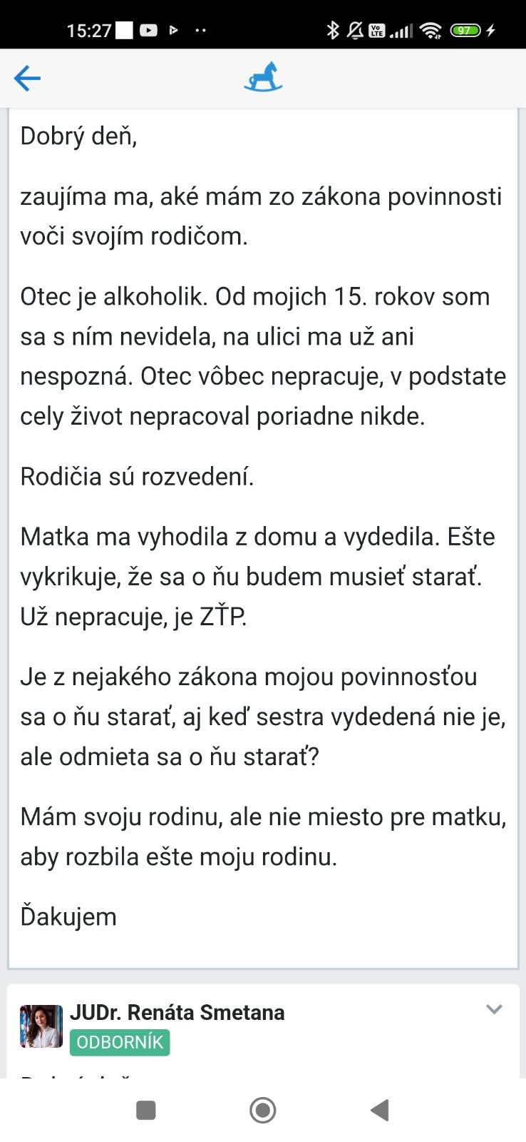 Dobrý deň, píšem ohľadom mojej rodiny, hlavne otca. Mám pomaly 19 rokov bývam s nimi. Môj priatel chodí do práce do Rakúska na týždňovky. Idem vždy na víkend k nemu. Ale počas týždňa čo som u rodičov, pytaju odomna peniaze alebo mi ich sami od seba berú z mojej karty. Proste si len ide otec do obchodu s kartou a zaplatí si. Chodím na celoročne brigády. Keďže potreboval pomoc tak som mu nechala kartu doma že keď budem v práci, tak nech ide do obchodu niečo kúpiť no nemyslela som si, že kartu bude mať stále pri sebe on. Nadáva mi, že nič nerobím, že sa mám o nich starať. Matka je nezamestnaná má 52 rokov. Otec má 69. Prídem v Sobotu ku nam aj s priateľom o 12:00. My že žiadna hádka alebo niečo také nebude. Nakoniec áno, o nič sa nestaráme, nič nerobíme, on musí pliesť košové výrobky aby boli peniaze. Podotýkam mám ešte brata ktorý má 14 rokov.