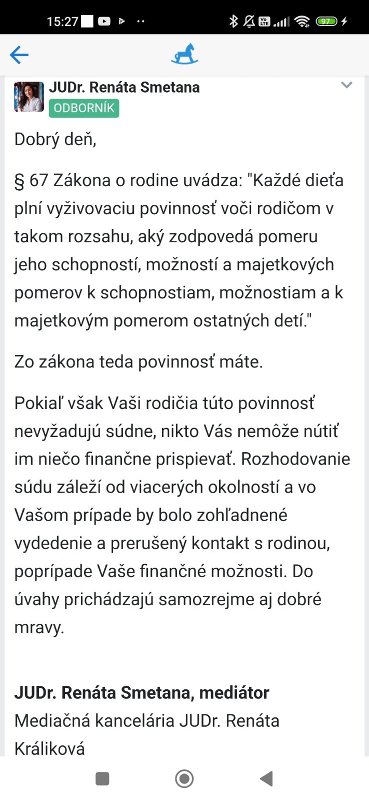 @eludka moze to vyzerat, ze rodicia su darebni. Zaroven pozname len pohlad autorky. Ja som popisala pravnu situaciu a co sa moze stat. Nevravim, ze ich ma teraz zivit. Ale aby sa pripravila, ze ich bude musiet zivit, ked to urci sud. Akokolvek sa jej to nebude pacit. Lebo niektore rady, ktore tu pisu, ze ich nie je povinna zivit, nie su uplne pravdive