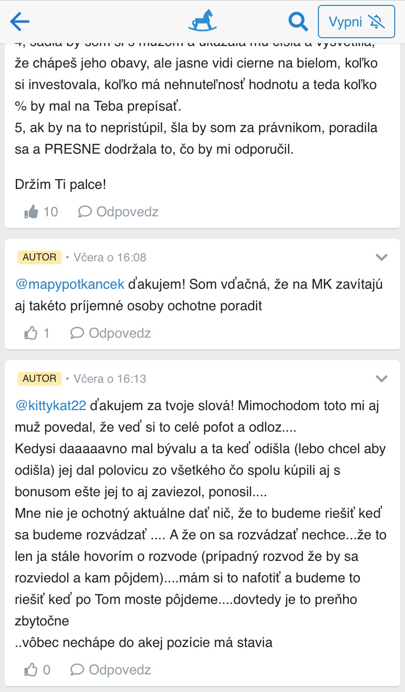 To je môj názor, že autorke v dome defakto nepatrí " ani kľučka", ako sa tu na koni zvykne používať fráza, lebo nemá žiadne doklady o investícii, možno by aj niečo vysúdila, ale fakt sa dá mužovi veriť či o 10,20 rokov bude charakter ?! A keď nebude mať z čoho ?.