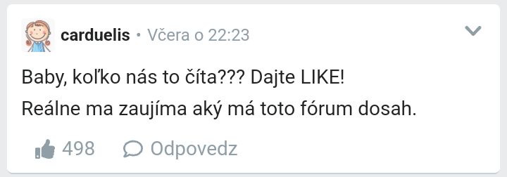 @amaro vsak a hovorim nieco ine? Hovorim navyse, ze clovek moze zabudnut alebo mu jednoducho sprava nepride, nevsimne si ju. Ja uz tu vobec nepisem o autorke, reagujem inej kocke na jej vyjadrenie, ze ona napise 2 sms a dost. A ty si tu do toho skocis, a cele to prevratis zas na autorku. Kazdy mame svoj sposob zivota aj reakcii, trochu respektu by mnohym nezaskodilo. Najma v anonymnych diskusiach