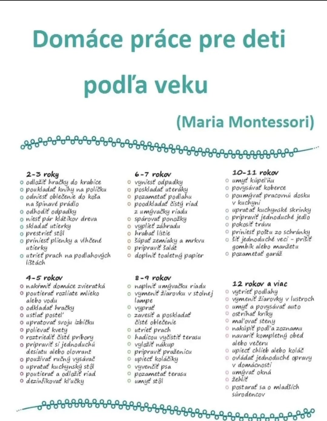 Ono aj bez tychto zakladnych veci je v dome stale co robit, takze velke deti riady, pradlo, smeti, odniest priniest odlozit = musia zvladnut ako nic.