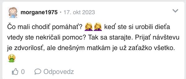 @morgane1975 ty to mas riadne pomylene, autorka sa pyta zien, ktore rodili cez Vianoce, ako mali zriadene navstevy. Ty jej tu zacnes vypisovat, ci jej mali rodicia pomahat 😂 no a na tvoj “nazor” na dnesne matky sa tiez nikto nepytal. Jedine, ze by si ho chcela pisat v inej diskusii. Najskor skus nacvicit citanie s porozumenim predtym, ako zacnes vypisovat “nazory”.