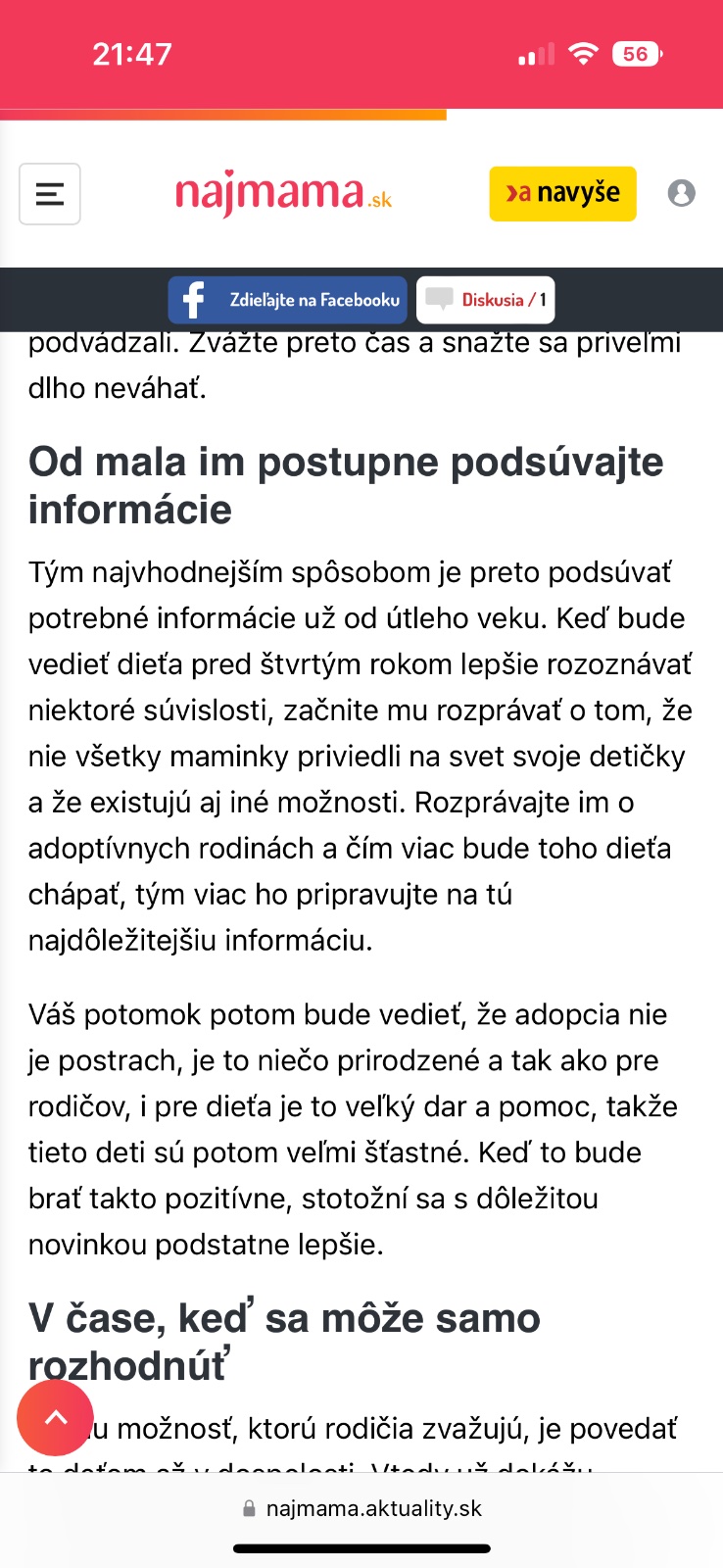 @liv1 nasla by som ti o tom milion clankov. Samozrejme mozu byt deti nevyzrete a nechapajuce, tak tym mozno neskor, ved psycholog poradi. Tak ako so vsetkym mozu mat iny nazor. Ale deti by mali vediet pravdu vcas, tak ci onak. Aby sa ju nedozvedeli od cudzich a aby ju dobre a prirodzene prijali.