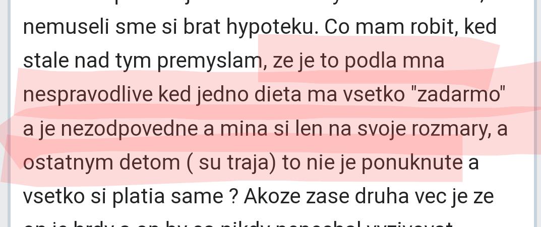 Ine by bolo, keby ste boli uplne samostatni vo vlastnej nehnutelnosti/podnajme a videli by ste, ze sestre sa pomaha a vam nie. Tam by sa dalo pochopit, ze sa citite ukrivdene. Ale takto... prepac, je to fakt smiesne.