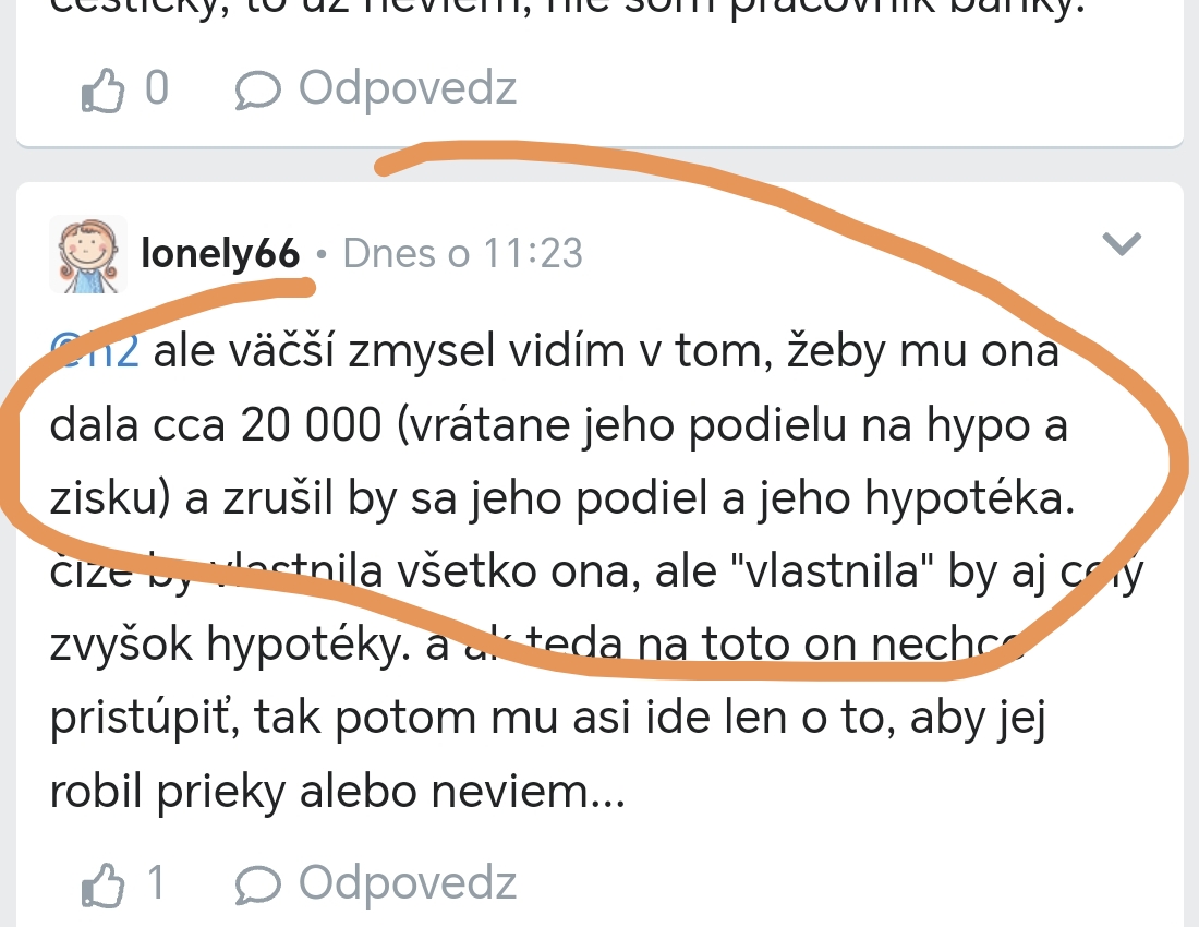 @lizatko1009 Ale on následne veľkou väčšinou tej sumy splatí svoju časť hypotéky. A autorka by bola radšej, keby sa to dalo nejako urobiť tak, že ona jeho hypotéku zoberie na seba a jemu vyplatí to, čo by mu zostalo, ak by to urobili tak, ako chce on. O tom sa však treba ísť poradiť do banky, či sa to dá takto spraviť. Až na to, že on nie je ochotný robiť niečo, čo chce jeho bývalá, proste z princípu.