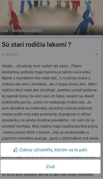 Ahojte ...chcela by som vedieť váš názor . Píšem anonymne, pretože moja mamina je takisto na koníku. Máme s manželom dve malé deti , z mužovej strany s rodinou nie sme v kontakte , ale z mojej strany áno . Mám rodičov, ktorí naše deti zbožňujú , potešia sa keď prídeme. Aj napriek tomu, že viem sko ich ľúbia, neviem sa zbaviť zvláštneho pocitu , prečo im nedoprajú troška viac. Ja som aktuálne na materskej, spoločný rodinný príjemné máme podľa mňa taký priemerný, doprajeme si občas dovolenku, na výlety chodíme pravidelne , nič nám dá sa povedať nechýba. Moji rodičia majú nadštandardné príjmy , mama zarobí 900€ v čistom , otec je na dôchodku a popritom normálne pracuje , spolu s dôchodkom má okolo 3200€ . Sú bez hypotéky , bez pôžičiek, majú dve autá a bývajú v novostavbe. Otec rád rozpráva o tom, koľko peňazí majú , keď je u nás na návšteve, doprajem mu to , ale začína mi to dosť vadiť , pretože svojim vnúčatám nedávajú absolútne nič okrem narodenín a Vianoc. Viem že sú to jeho peniaze, ale na to ako ľúbi svoje vnúčatka, nenapadne mu niekedy aspoň staršej vnučke dať 2€ na zmrzlinu alebo tak... minule vzal staršiu dcéru plávať a čakal kým mu dám 6€ na vstup. To sú veci ktoré ma zarážajú... alebo sme ho poprosili aby nám zaslal keď išiel na poštu balík a tiež povedal že to bude stáť 2€ .Keď tu boli kolotoče dopriali sme dcére pár jázd a prišla nadšená k babke a dedkovi a povedala že ešte išla či by nešli s ňou , čakal som že aspoň tam jej urobia radosť ale povedali že to je škoda peňazí a že už bola dosť s nami .Takýchto príkladov bolo veľmi veľa ... Chcem len vedieť váš názor .vďaka