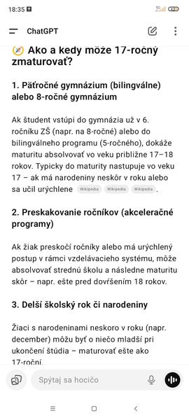 A nie, ChatGPT samozrejme nepovazujem za doveryhodny zdroj, ale namatkovo a narychlo som si tam overila 1 vec a vyplul mi nejake moznosti, ze sa stale da maturovat i skor. Samozrejme do dizertacky by som ho nepouzila, ale myslim, ze pre MK uvolnenu a neformalnu diskusiu staci (aspon teda mne :D). 🙂