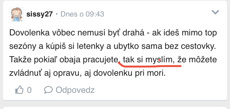 @sissy27 nejde o cenu dovolenky, aj my cestujeme po celom svete bez cestovky, ale ty tvrdis, ze zvladnu aj opravy na dome, aj dovolenku, pritom nemas sajnu, kolko maju na ucte a kolko ich bude stat oprava.