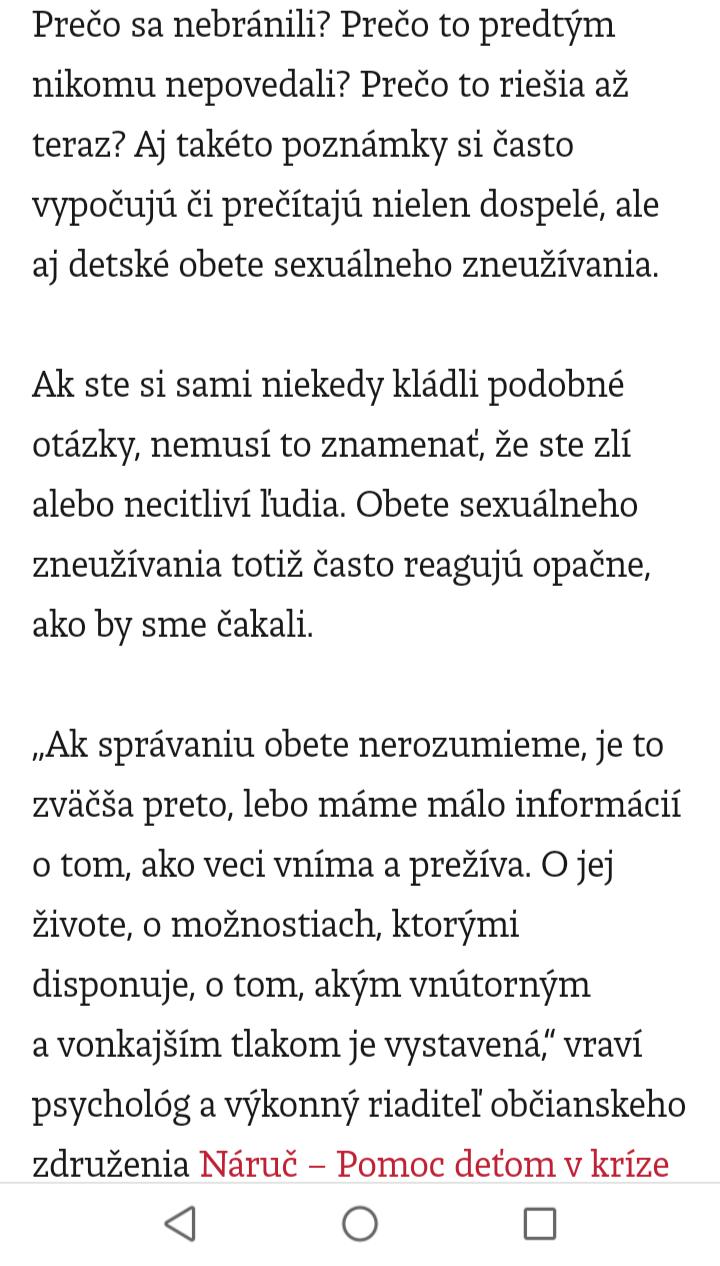 @nataly420 toto prave ako hovoris, uz davno mala byt u psychologa, a ty si myslis ze je jednoduche s takymito vecami ist "von" ? Si velmi neempaticka v tomto. Nemozes takto posudzovat niekoho ze co mal a nemal spravit. A kedy to mal spravit. Poznala som jednu pani,mala 70 rokov ked dokazala prvy krat o tom hovorit ze ju vojak pocas vojny znasilnil... vies velmi malo o tychto veciach tak nesud ze co kedy mala urobit.