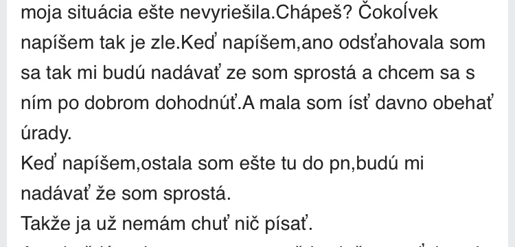 A k čomu by to bolo dobré dopodrobna opisovať čo sa dialo v piatok,sobotu? Alebo ďalšie dni? Nie,už nemám chuť.Pochopila som že vždy sa najde niekto kto to spochybní. A nie neostala som pri ňom ani nemám umýsel sa vracať.Pozri si video čo tu pridávala jedna paní v ktorom 3 ženy opisujú svoj život.Ty by si ostávala s takým človekom?