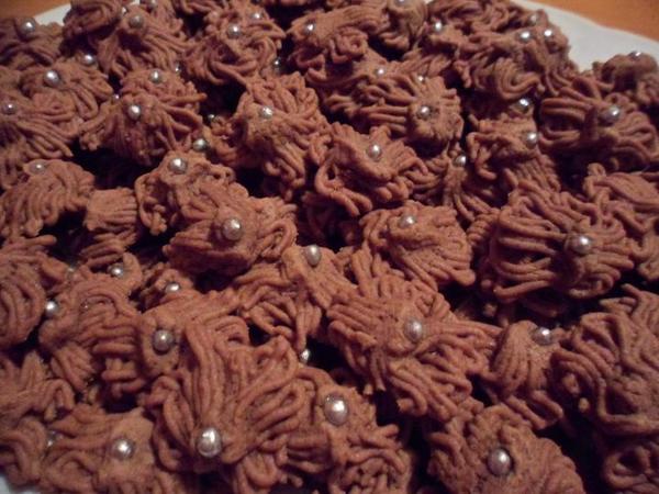 Zo vsetkych surovin urobime cesto a nechame ho asi hodinu odlezat.Potom si z celeho cesta urobime male gulocky a postupne ich pretlacame lisom na cesnak do tvaru klbka.Ozdobime perlickami.Pecieme asi 6-8-10 minut na 180 stupňoch.Samozrejme podla toho aku mate ruru.Niekomu staci aj 6 minut,aby neboli potom velmi vysusene a tvrde.Jeden vezmite z pekaca a skuste,ci je upeceny zospodu.Pečieme na papieri na pečenie.
