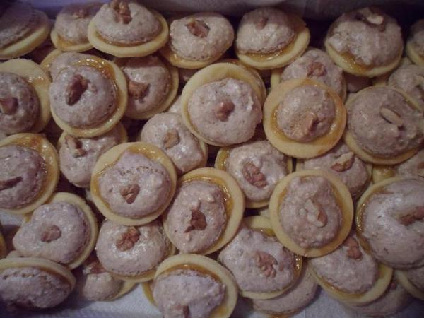 peciem rada a fakt vela, kedze nas je ako hadov 😀 ,ale pomahaju mi aj decka..milujem tu sviatocnu atmosferu, pesnicky, vona kolacov a rodina pokope...u nas nesmu nikdy chybat - JAGERSKE GOMBIKY - RECEPT -CESTO: 30 dkg hladkej múky, 14 dkg Hery, 5 dkg masla, 6 dkg práškového cukru, 3 žĺtky, Na potretie marhuľový al. ríbezľový džem, Na vrch: ušľahaný sneh z 3 bielkov, 20 dkg práškového cukru, 20 dkg mletých orechov... Cesto vypracujeme, vyváľkame a vykrajujeme kolieska. Kolieska potrieme džemom. Sneh vyšľaháme, pridáme cukor a zľahka vmiešame orechy. Na džem dáme kopcom lyžičku snehu a trošku rozotrieme, naozaj len trošku, aby moc nestiekol. Na vrch položíme kúsok orechu. Pečieme pri teplote 150 st. cca 20 min. pekne do ružova.