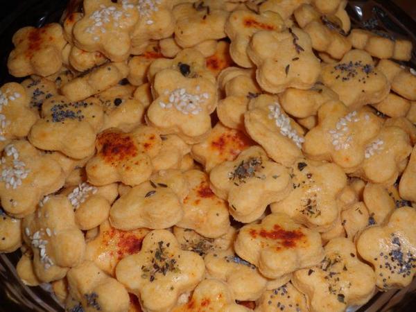 krekry- 250 g polohrubá múka,1 čl mleta červena paprika,1 čl soli,štipku mlete čierne korenie,150 g masla /hera, palmarin../,125 g tvrdeho syra / nastruhat/,1 žltok, 3 čl citron.štavy ..vsetko spolu zmiesame, /ja som vymiesala rukami, môze aj mixerom/..vyvalkame na hrubsie/kuk foto ako asi, nezväcsia svoj objem/, dame na plech na papier ,potrieme ich bielkom a posypeme /ja som davala mletu cervenu papriku, sezam, mak, rascu a pizza korenie/ a dame upiect o vyhriatej rury na 200 stupnov na ca 10 minut