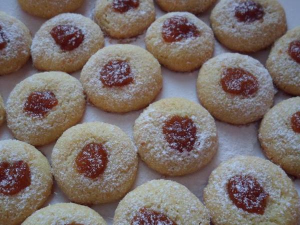 Z múky, cukru, soli, pomarančovej kôry, žĺtkov a masla vypracujeme hladké cesto, z ktorého tvarujeme asi 40 ks guličiek /veľkosti vlašského orecha/. Poukladáme ich na plech vyložený papierom na pečenie. Do každej guľky vtlačíme prstom jamku, do ktorej dáme trochu džemu. Pečieme asi 15 min pri teplote 190 stupňov. Guľôčky sa počas pečenia rozlejú na kolieska.