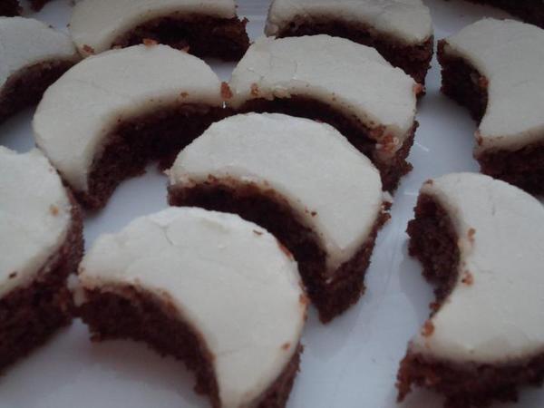 rumove mesiace na mensi plech -5 zltka vymiesami s 5 polievkovym lyzicami praskoveho cukru, pridame 250 g tuk / palmarin, hera, smetol...../, vymiesame, pridame 1 a pol polievkovych lyzic kakao, 100-150 g orechov , 5 pol. lyzic polohrubej muky 1 prasok do peciva a nakoniec vmiesame 5 bielok / vyslahany sneh/..dame na mastny papier alebo alobal a pecieme na 180 stupnov.poleva - tak asi 1 deci rumu zmiesame s praskovym cukrom..cukor pridavame tolko , pokial hmota nie je akoby biela a nie je ani velmi husta a ani riedka..tak aby sa dala vyliat na kolac..tuto polevu vylejeme este na horuci kolac a nechame chvilku vychladnut a môzme vykrajovat mesiaciky..okrajkov je minimum..vyjde kopu mesiacikov a hlavne..je to velmi chutny kolacik ... / rum sa da nahradit aj citronovou stavou/