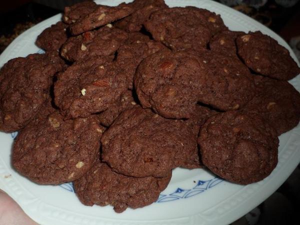 cookies-125g maslo /alebo hera,palmarin../,200g práškový cukor, 1 vajce,220g polohrubej múky,2 lyžice kakaa,prášok do pečiva,1/2 čajovej lyžičky sódy + cca 150 x mix / je o uz a kazdom, ja som dala na kusky nakrajanu varovu cokoladu, nakrajane hrozienka, mandle, orechy..co sa mi skratka zvysilo z pecenia/..vsetky suroviny si spolu zmiesame ,okrem toho 150 g mixu.ten dame az uplne nakoniec a zlahka ho zamiesame do cesta.. lyžicou naberame kôpky a dame na plech / ja davam na mastny papier/. tak od seba a pecieme na 180 stupnov