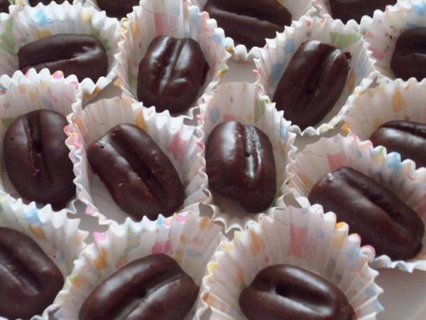 kavove zrna -8 dkg cukru, 12 dkg pomlete piškoty, 8 dkg maslo / klasika maslo alebo hera, palmarin, .../, 2 lyžice kakao, 1 lyžica instantná káva, 4 lyžice mleté orechy, 2 lyžice rumu. Čokoláda na poliatie.