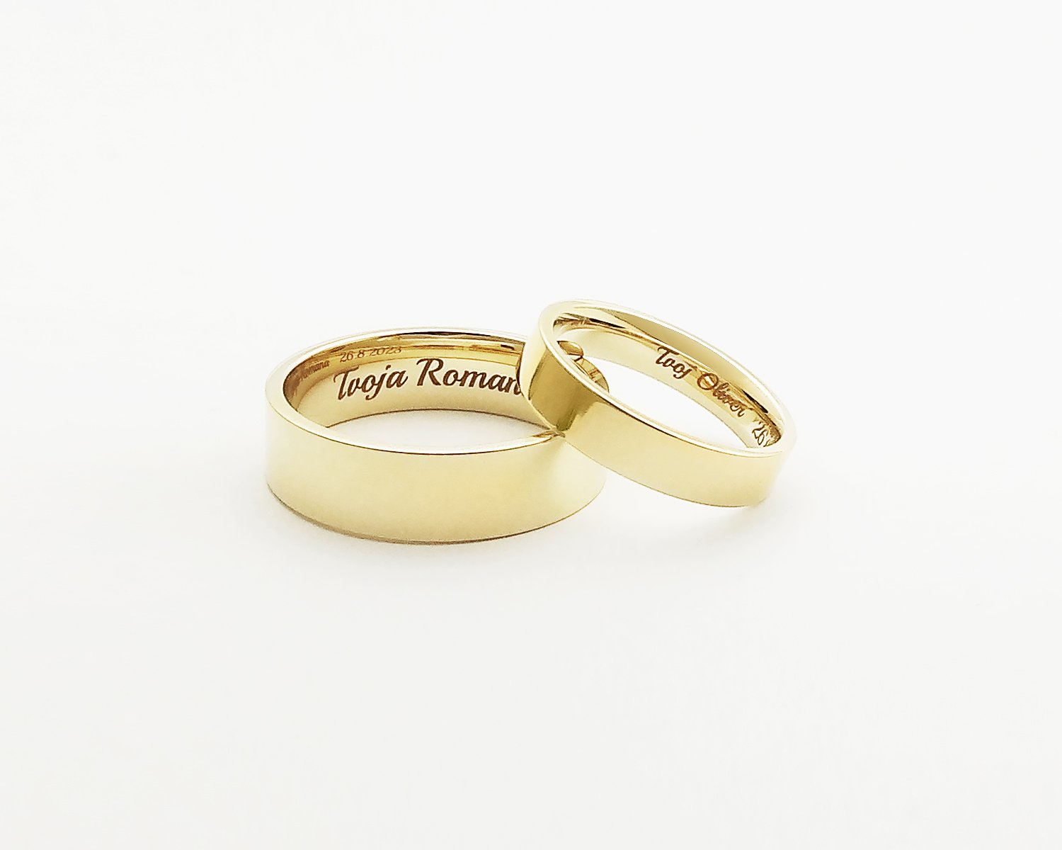@lia2022 presne takéto nás vyšli pred 4r okolo 500e . 4mm široké (mam hrubšie prsty tak širšie nám neodporucali) . Žlté zlato, hladké obrúčky a z vnútornej strany gravírovanie