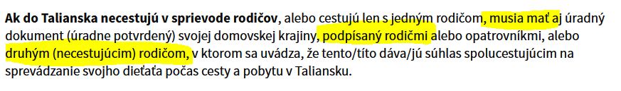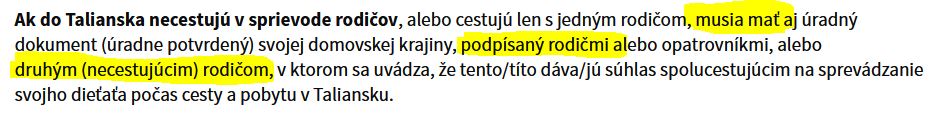 Taliansko - musia mať podpísaný rodičmi, druhým (necestujúcim) rodičom