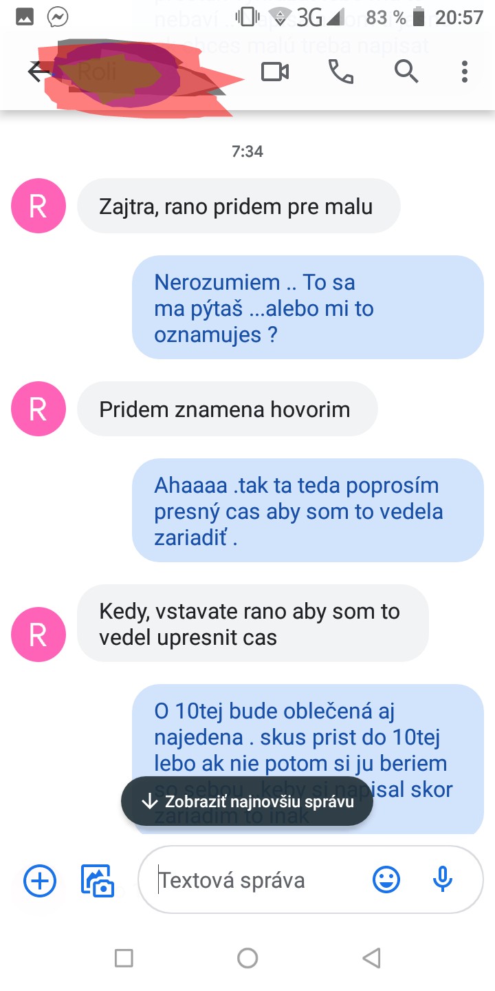 @mogaa tomu vsetkemu rozumiem . . . ano stale som od neho vyzadovala to aby mi napisal aspon sms alebo zavolal keby sa nieco stalo ze sa zdrzi alebo ze nieco mu dotoho prislo lenze z jeho strany to tak nie je .. on mi neda vediet . jednoducho mam pocit ako keby mi robil všetko naschval . doteraz som bola ja ta ktora mu vo vsetkom vyhovela . . . ale zakazdym skakat tak ako on chce sa neda . . . smutne je to ze neviem dokedy sa to bude natahovat s tym sudom lebo zatial nemame ani len dalsi termin a ktovie ako to bude s covidom . .. komunikacia s nim je biedna ci uz ohladom penazi a vsetkeho okolo toho .. stale sa vyhovara len na to ze ma take iste prava ako ja a ze ked to nebudem respektovat bude to riesit policiu.. nemam s tym ziadny problem mu ju dat ide len o to ze ked ma rovnake prava ako ja tak ma aj rovnake povinnosti ako mam ja .. a nie len vtedy sa zaujimat o dceru ked on ma cas a naladu... raz sa stalo ze som suhlasila s tym aby spala mala u neho .. doniesol mi ju vecer o 22:00 ze velmi place a nechce zaspat..