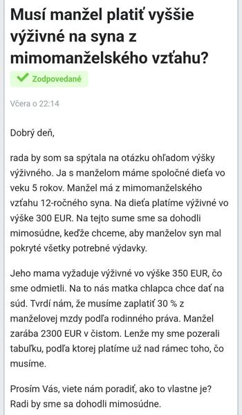 @majamat všetko si spíšem a dám to na súd. Nemyslím si, 300 € je veľa. Ja starám 24/7 on nič. On si žije so svojou novou ako pán a na vlastneho syna je žgrlavy
