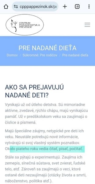 Nadane dieta ma kopec roznych inych schopnosti a zaujmov, ako sa pise aj v tvojom screenshote. Posudzovat nadanie dietata len podla schopnosti citat je preto nespravne.