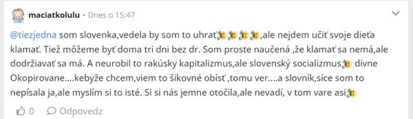 @vroni jáj, pani sa točí na komunizme, to vy chytré horákyne viete😉 Socializmus viac vyhovuje? Lepšie?😎 Ešte raz a polopate - kto porušuje školský zákon tým, že dieťa riadne ospravedlní zo školy, tak ako to umožňuje zákon??? Vieš odpovedať k veci? Alebo len vulgárne hulákať a robiť vokály @maciatkolulu, ktorá už skoro stráca príčetnosť ...😉 Že niekto nemá možnosť rozhodovať o svojom čase a štve ho, že iní ju majú a využívajú, nie je protizákonné jednanie ani "ojebávanie", keď použijem tvoj slovník. Je to tak maximálne vaše mrzenie. Alebo závisť. To si preberte ako chcete.