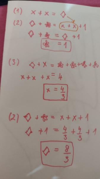 Keby v prvom riadku namiesto jedného krížika bola kvetinka. Tak potom kvetinka=2, krížik=3 a kosostvorcek=5 Tak by to bolo pre štvrtákov primerané.