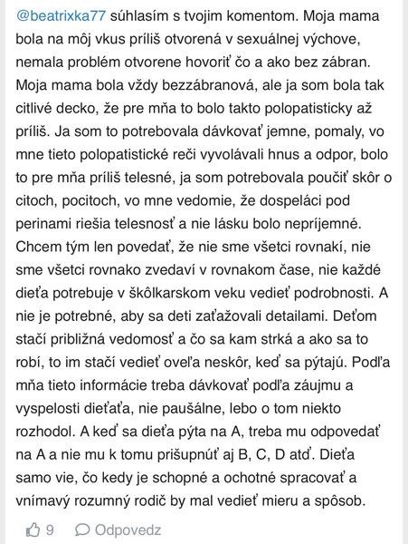 Čo je tam hrozné ak 7,8 triedy budú vedieť, že pôrod bolí? Že to jedna z najťažších situácii v živote ženy? Na základe ich veku, aj tak už dávno videli holé prsia na internete tí chalani, v reklamene sa hovorí o vaginálnej suchosti 😀. Si myslíš, že tie decká to nepočujú ? Nevidia? Že tvoji synovia na internete nevideli holú ženu? Ale áno, nech si chlapci pozerajú porno, a potom si budú myslieť že tak má vyzerať láska a sex. Tvoje názory úplne mimo, tu ideš rozprávať o citlivosti. A keď počujú o vojnu? Mŕtvych deťoch? Holokauste ? To nie je traumatizujúce? A čuduj sa svetu púšťajú sa na dejepise dokumenty vidia tam kopy mŕtvych tiel, a ano jedno dieťa neprišlo domov s tramou. Ale kde ide o sex, nie ,nie to je zle