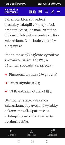 Ahojte, kamarátka mi vravela, ze je potrebné vrátiť bryndzu pilos do lidlu z dôvodu výskytu baktérie? Je to pravda, počuli ste o tom? Ja som 22.12 kúpila balenie 125g. Spotrebu ma bryndza do zajtra 26.12. Mam ju vrátiť, alebo vyhodiť?