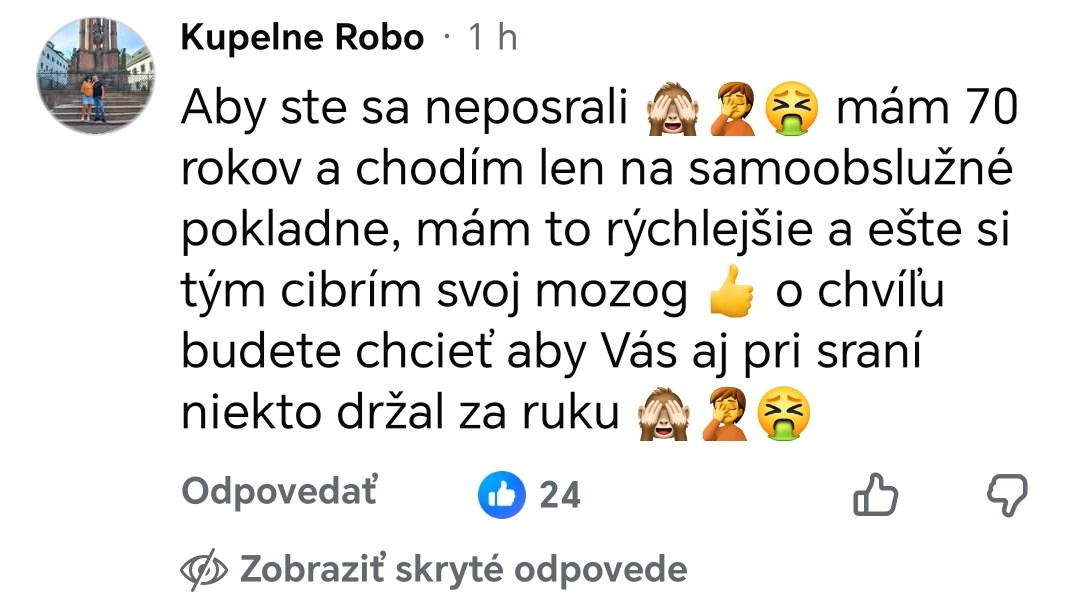 @janinah Ked som to pred vela rokmi videla v UK a u nas este nic take nebolo, tak som si hovorila ze wow, to je ake dobre, pridem, naskenujem, šup šup a vybavene. Niektori by sa mozno radi vratili k pultovemu predaju, kde obsluhuje potraviny predavacka a ucet zapisuje na paragon 🙈 ved to sa da vztiahnut na cokolvek, aj tie navratne flase do flaskomatu, tiez to tam ludia hadzu samy a kedysi bolo okienko kde tetuska preberala a rucne pocitala flase. Takychto prikladov sa da najst kopa, cize ideme hejtovat nieco co je pokrokovejsie a ulahcuje nam zivot, ano? Komu to nevyhovuje, nech stoji v rade na pokladnu a caka kym nablokuje tych pred vami a medzitym sa stiha porozpravat s kolegynou cez sluchatka