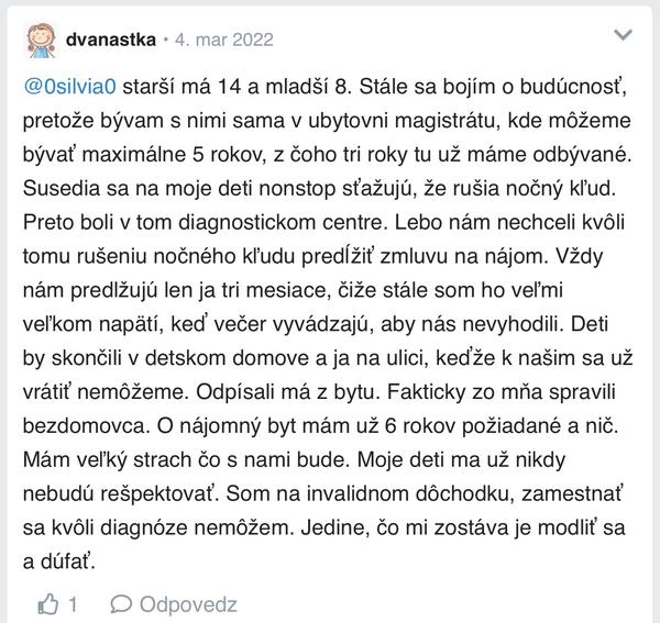 @layla123321 vďaka za kontakt. Ja už som písala a žiadala o pomoc aj úsmev ako dar. Vôbec mi neodpísali. Volala som aj do podporovaného bývania, ale tam zas nezoberú deti, iba mňa.