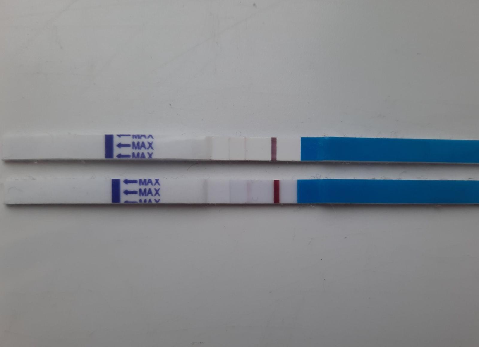 Ahojte. Pred 2 dnami som si robila test z ranneho mocu (na foto horny test), dnes som 29DC a zo zvedavosti som si urobila opat test, ale nie z ranneho mocu (spodny test). Zda sa mi,ze ciarka zosilnela len malo. Moze to byt len tym,ze to nebol ranny moc, alebo je normalne, ze to tak pomaly silnie? Cyklus mam posledne mesiace rozhadzany od 27-34dni. Min.mesiac som mala zrovna ten kratky,takze netusim aky by som mala tento mesiac 🤷♀️. Ms zatial neprisla, dnes ma obcas pichlo v podrusku a rano som mala krce v slabinach. A este ma posledne dni trapi riadna zapcha zial 🙈. Tak snad je vsetko ok,ci?