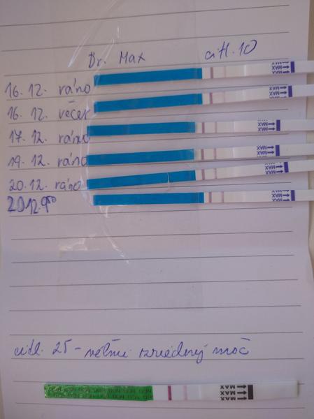 ahojte, mam 38r, 10r syna, 2r sa marne snazime o babo. Teraz od oktobra mam doma injekcie na IVF, no co som mala 25r ukazkovy cyklus, ako hodinky /26d/, tak mi zblbol, v novemnbri bol 16 - dnovy, teda MS som dostala na 17 den. Takze stimulaciu som nezacala, ze teda odlozime.. No a vcul som 32. DC (21 DPO a 18 DPO - to viem presne ze som mala dve ovulky) a menzes nikde, zato testy mam od soboty pozitivne. Nikdy som si nemyslela ze budem si fotit ocikane palicky 🙂. V sobotu bola 1. ciarka taka slabsia, na dalsi den silnejsia a potom posledne 3 dni takto ako na foto. Dnesna ranna sa mi zda slabsia, co poviete? uz som si povedala ze to bude posledny test ale som z toho na nervy, chystam sa asi v pondelok uz k dr nech mi radsej urobi UTZ, ci to neni cysta Ten posledny je z dnesneho obeda, citlivost 25. Este chcem dodat, ze posledne dni ma bolelo strasne brucho, to vcera ustalo , vcera ma prestali aj prsia boliet, no dnes doobeda zas boleli, teraz len trosku a sem tam zacitim vajecnik