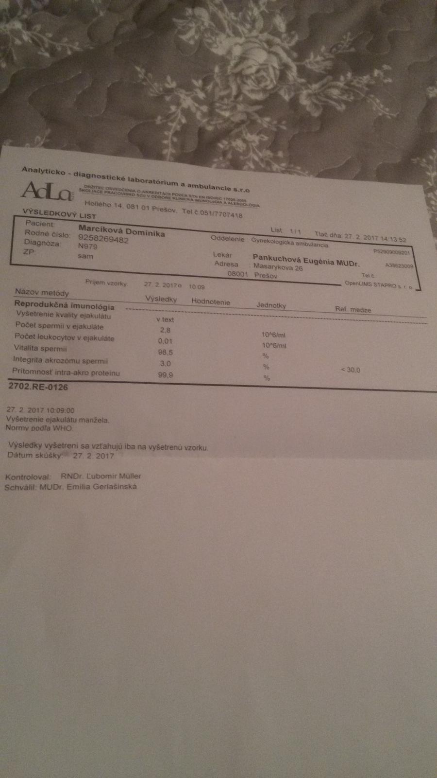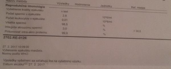 @trblietava chybaju ti tam referencne jednotky... tiez mame doma papier z tohto laboratoria... pri pocte spermii mate referencne hodnoty norma > 15x 10^6/ml preto sa mi vidi ze je ich nejako malo... ale zasa maju velmi dobru vitalitu norma je >58%, pri integrite akrozomu je norma <30% poskodenych... teda to mi vychadza ako velmi dobry vysledok, a posledna hodnota pritomnost intra akrozomu norma je >90% spermii cize tiez dobre... len ten pocet sa mi nezda.. ale mozno to len zle interpretujem.. a este pocet leukocytov norma je <1x10^6/ml