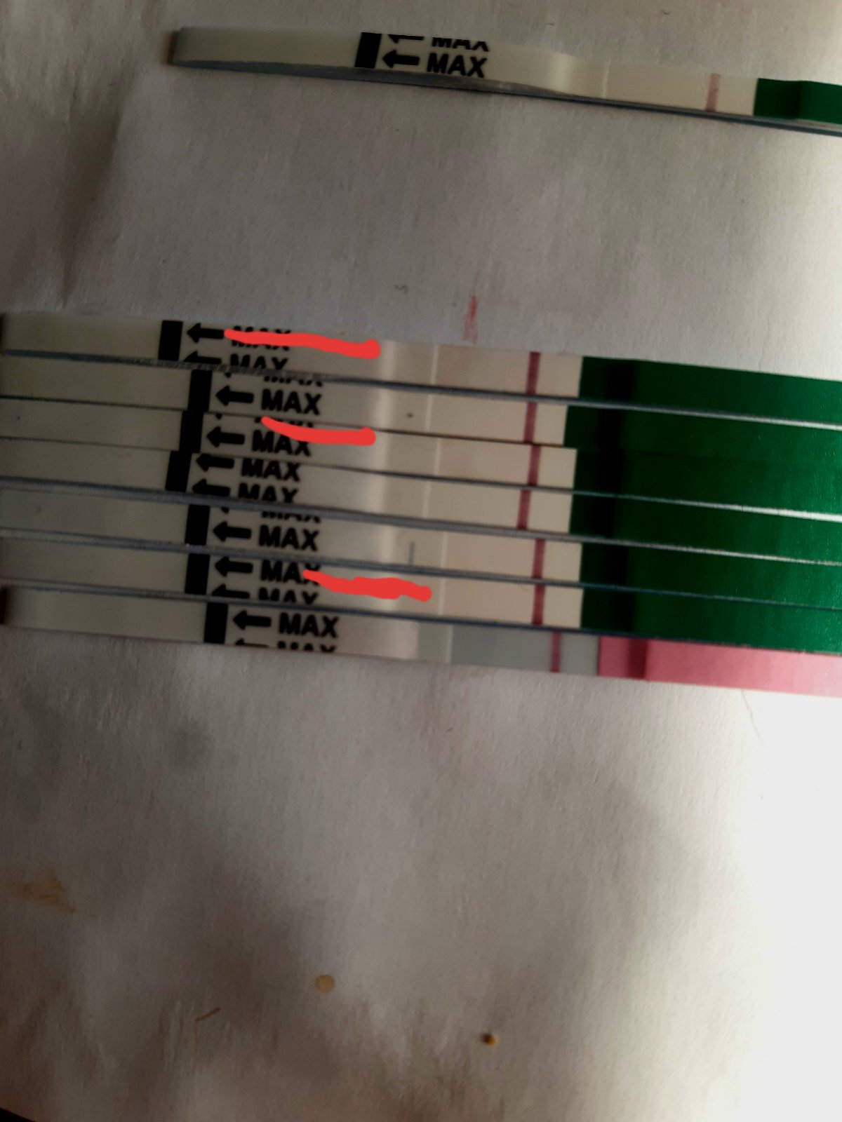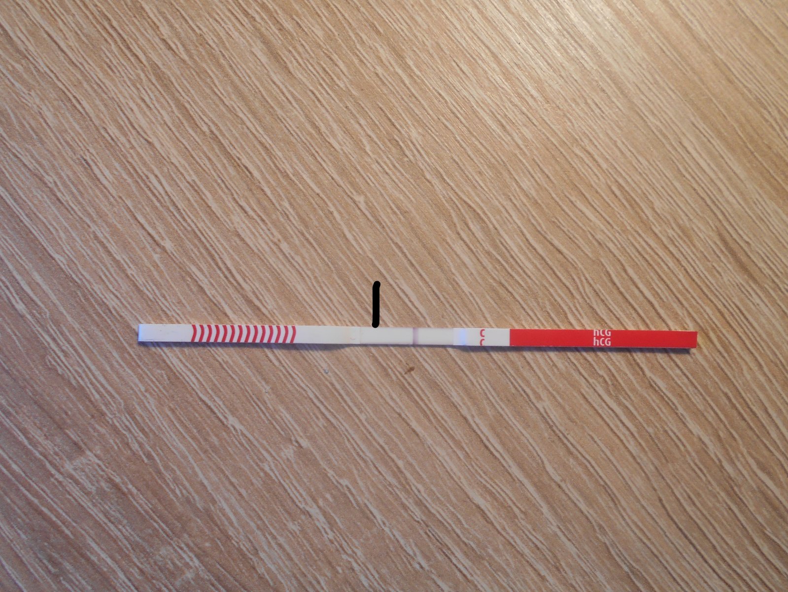 ahojte baby..12 dni po operacii,ms by podla planu mala prist zajtra..nasla som jeden zvysny test,tak len tak zo srandy som si spravila..a tam dalsi slabucky duch!na fotke neni moc dobre vidiet (ani neviem,ci som to oznacila spravne,mozno kusocek doprava od tej ciary),ale je tam,rovnako,ako som mala predtym..a nechapem,ze co to ma znamenat..ked mi robili testy na hcg pred operaciou,tak som mala velmi malo,samozrejme,dnes uz vieme preco..a 12 dni po uz nemozem mat ziadne hcg..co si zase zo mna robi srandu?😢