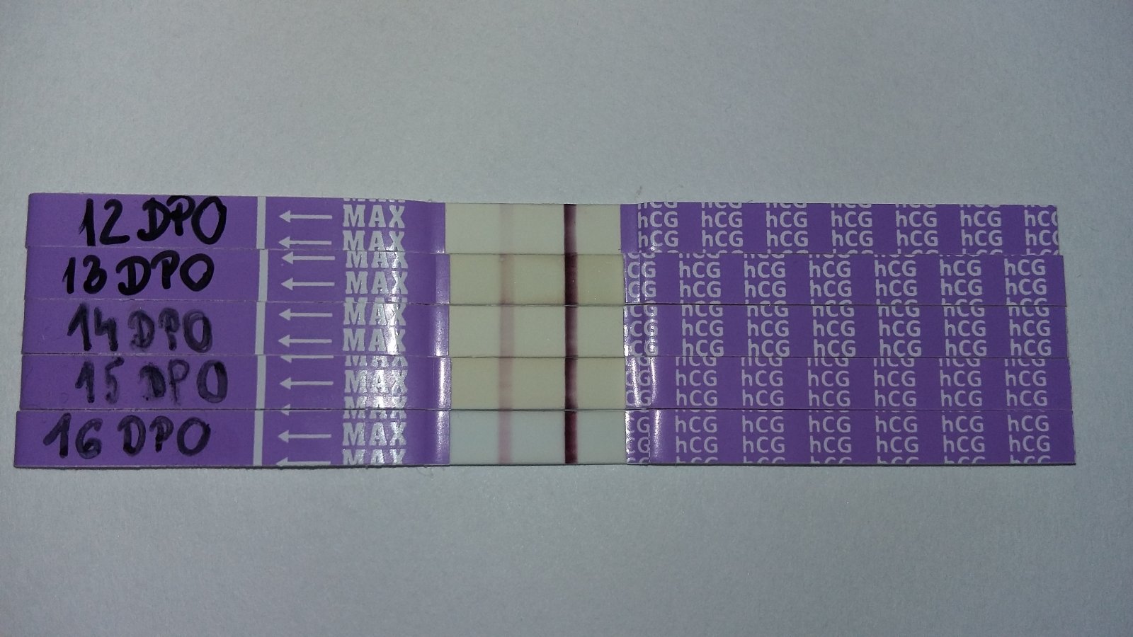 Ahojte baby! Prikladám tie fotky, aby ste videli, že zelené One Step testy (vlastne moje zelené testy) majú byť vadné, alebo obsahujú oveľa menej farbivá, ako ostatné testy. Dnes je 16 DPO. Prvé 3 fialove sú Gravitesty, posledné 2 Mamatesty. Naozaj sranda ten rozdiel :S