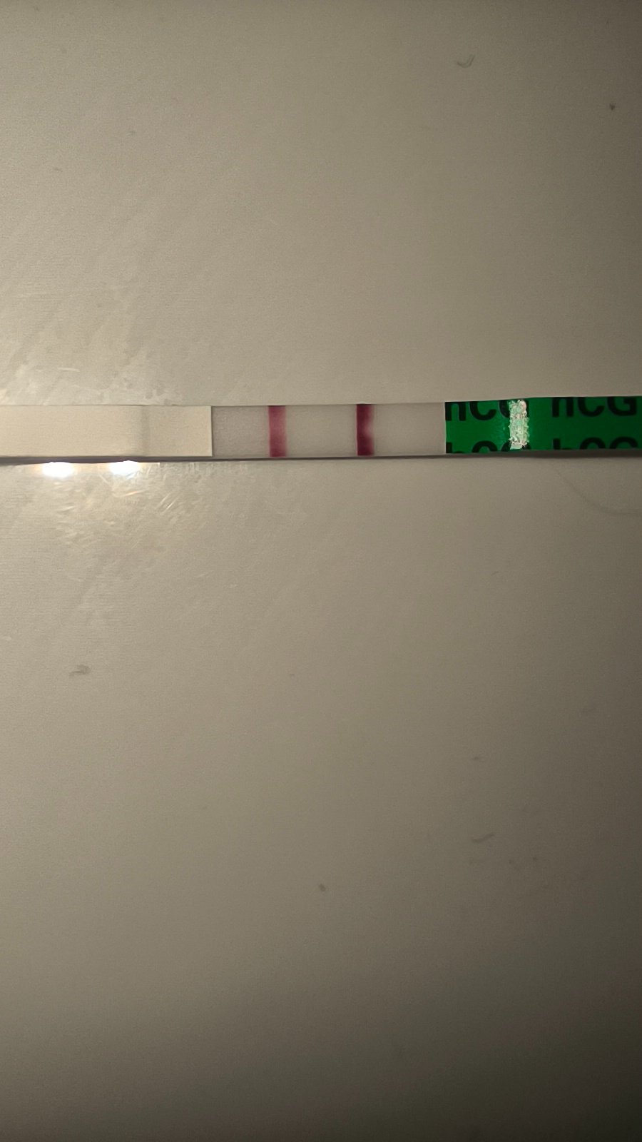 Ahojte, prosím vás, menštruácia mi mešká 10 dní a chcela som minúť jeden test čo mi zostal, tak som si ho len tak spravila. Ale výsledok sa mi moc nepozdáva, nemala by byť tá čiarka oveľa silnejšia? Pri prvom som mala už druhý deň meškania riadne koľajnice, tam bola možno ešte silnejšia ako tá kontrolná tak neviem či je to normálne. K lekárovi idem až o dva týždne...