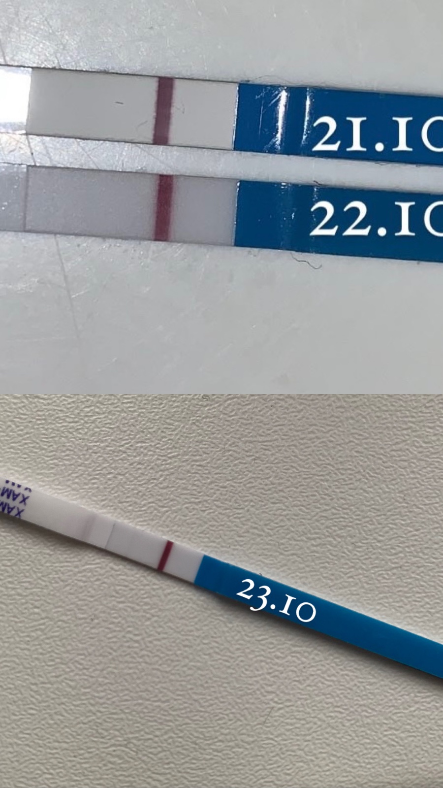 @nina0412 nechcem dávať falošné nádeje ale mne dr max najprv ukazoval tiež takmer neviditeľnu ciarku (začiatok príspevku) a dnes už bola o dosť výraznejšia. Moja zo začiatku príspevku je podľa mňa porovnateľná s tvojou dnešnou. Určite je aj tvoja výraznejšia oproti 21.10. A aj na tom ružovom teste sa niečo črtá. Počkaj a uvidíš, ja by som to ešte nezahadzovala