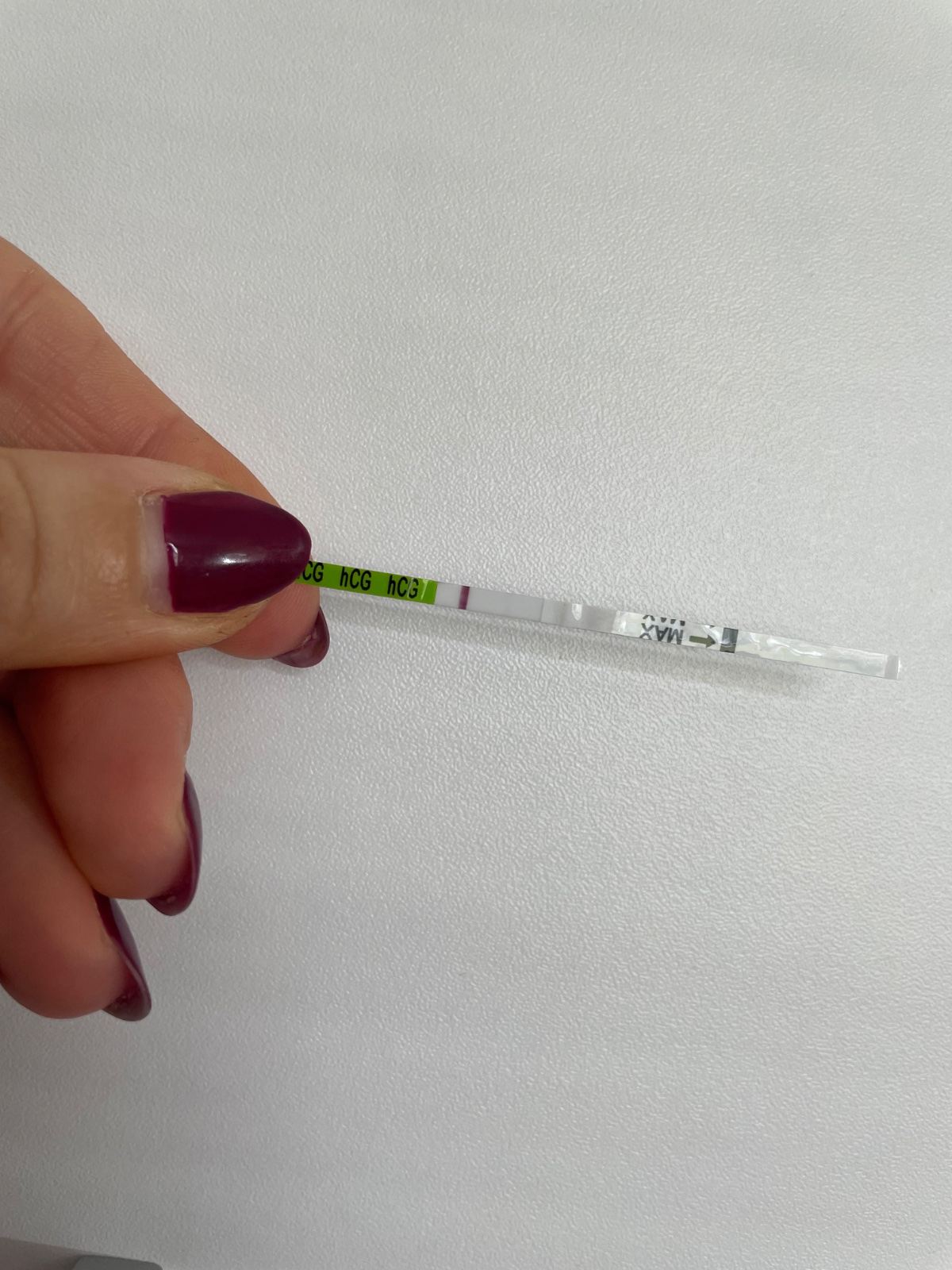 Ked ocikavas test, mas ocikat iba tu koncovu cast, maximalne po ciarocku ktoru ukazuje MAX, je to jasne znazornene a aj napisane v letaku. Nema byt ocikany nikde vyssie, a uz vobec nie cely premoceny aj v casti kde ho mas drzat a chytat (aj tam kde pise HCG sa ti to cele leskne od mocu).
