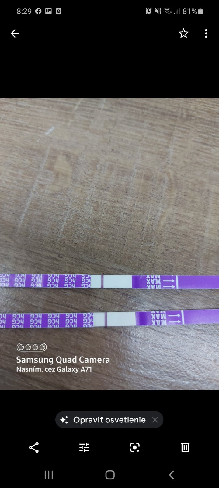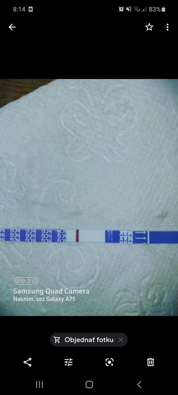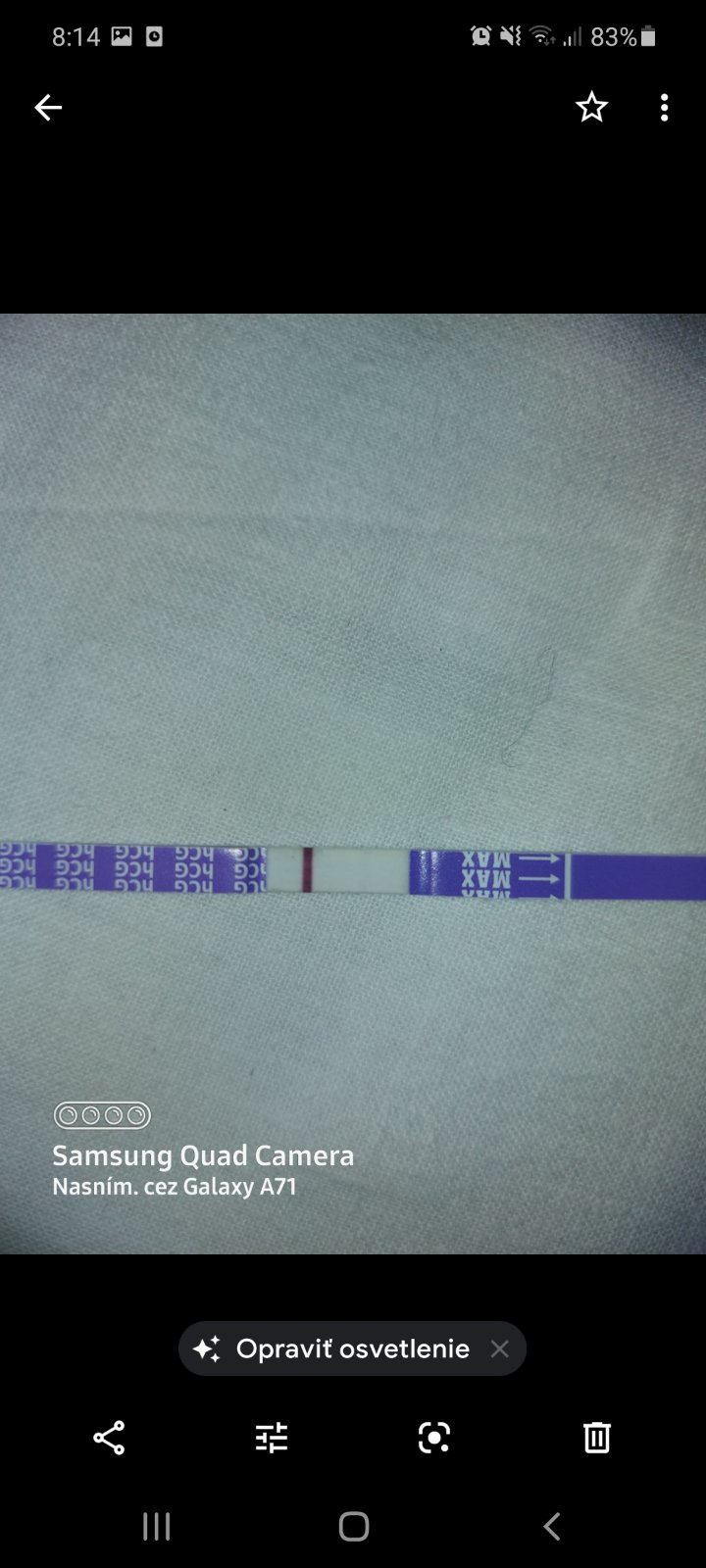 Poslala som rano kamoske fotku testu a teraz ako mi odpisala som si na nom vsimla ako by druhu ciarku. Viem ze je to kravina lebo by uz musela byt silna ale vidis ju tam?