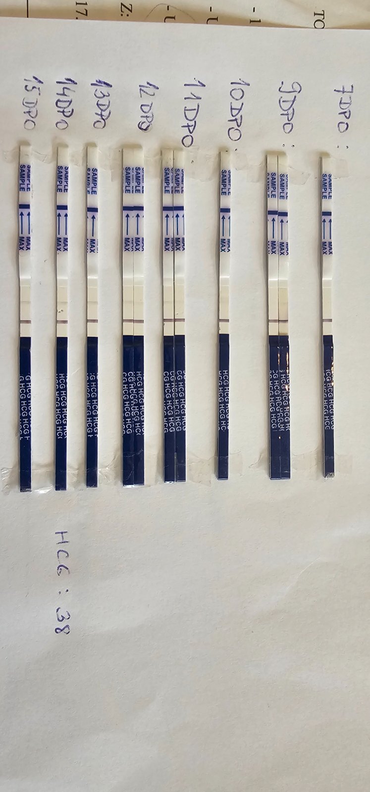 Ahojte. Zaujima ma ci tu nieje niekto kto mal podobny scenar ako ja a ci je mozne ,ze to bude OK. Prikladam foto testov. Momentalne som 15 DPO. Vcera som bola na krv na hcg (kvoli predoslym 4 potratom). Hodnota mi vysla malicka - 38 jednotiek....navyse tie testy nejak netmavnu..tri dni po sebe su take nejake +/- rovnake. V piatok idem na krv, tak zistim viac..ale dovtedy....vase skusenosti? Vdaka vopred