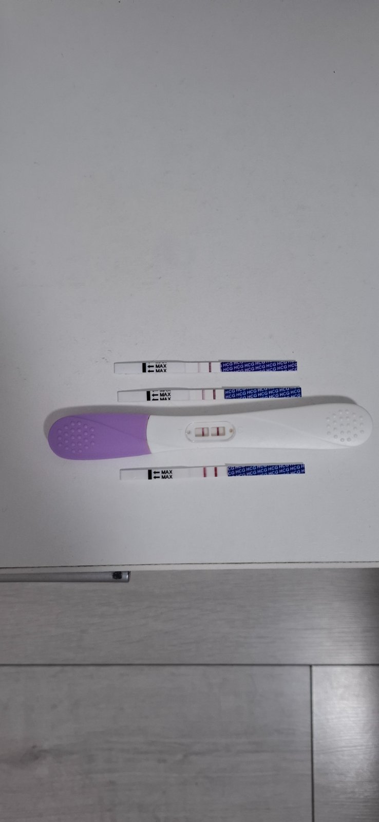 Ahojte, v prvom rade som v totálnom šoku, pretože pred mesiacom mi povedali, že mám nepriechodné vajcovody a mám ísť na operáciu, aby ich vybrali. Teraz mi mešká 2. deň (3.deň menštruácie by bol), mám vyššiu bazalnú teplotu (oura ring), a včera mi to už nešlo do hlavy, bolo mi večer zle. Tak že ráno spravím test, a bum (viď foto)- prosím neukameňujte ma že sú rôzne značky - odteraz budem už len jednou testovať, ale nemohla som tomu uveriť. Pred cca 6 dňami som mala 1x pri utretí rúžovkastý výtok, ale nepripisovala som to ničomu, lebo som brala tabletky od spodu na candidu. Strašili nás v centre že ak by to vyšlo môže to byť mimomaternicové tehotenstvo. Moje prejavy sú len bolesti podbruška ako pri MS, trošku prsia, a odvčera večera žalúdok ako na vode. Verím, že to bude ok a testy budú silnieť. Tie ktoré ste mali MM mali ste rovnaké testy alebo niečo? Prepáčte asi hľadám len upokojenie. K doktore som objednaná.