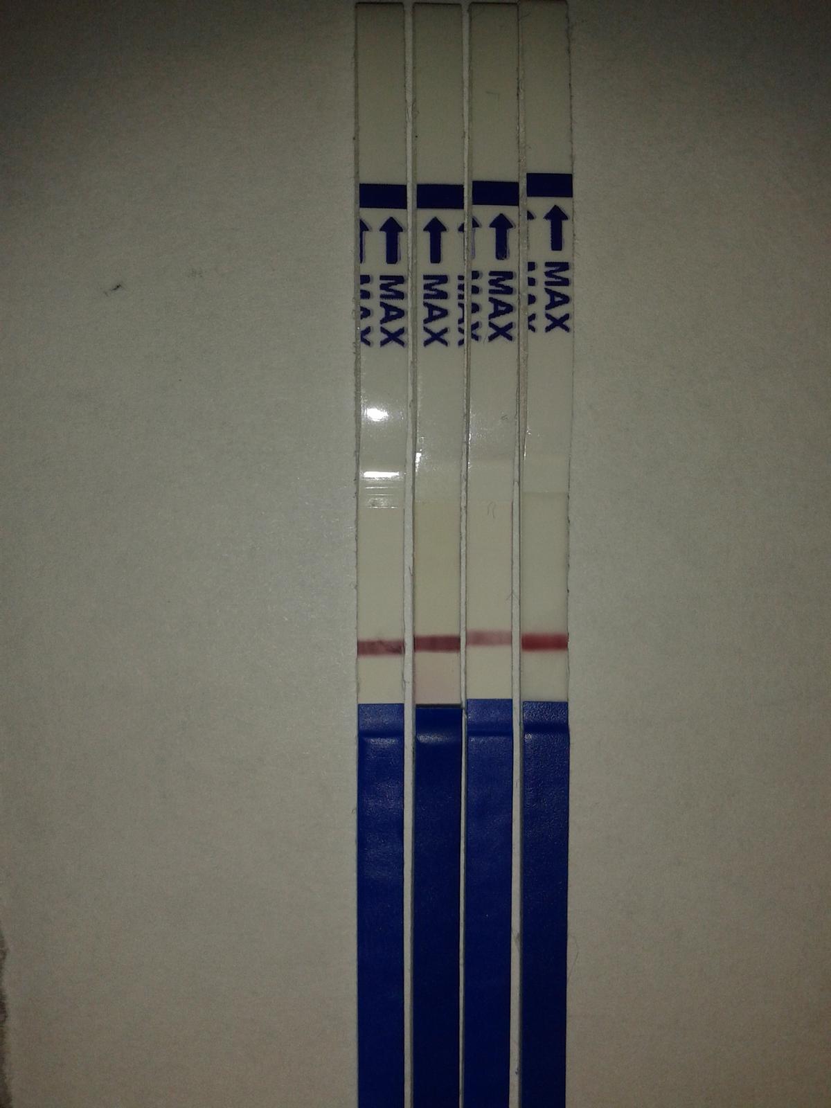 @ccaro faaaakt? 🙂 prave pozeram, ze na tej foto to az tak nevidno ako v skutocnosti.. ale potesila si ma 🙂 tie prve tri testy zlava boli robene predvcerom a ten napravo dnes rano.. ale je to divne, ze na tom dnesnom nie je ta ciarka uz silnejsia.. prave naopak, zda sa mi najslabsia.. a vcera som si robila aj ten digitalny test a vysiel negativne ☹ tak ja uz neviem..