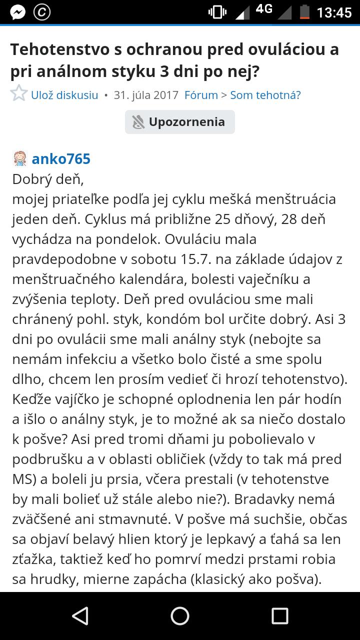 Ahojte, mohli by ste mi napisat Vas nazor respektive skusenosti? Ide o to, ze menstruaciu dostavam pravidelne cca kazdych 27 dni, vacsinou je to vzdy o den alebo aj dva SKOR, nez co mi ukazuje kalendar. V kazdom pripade, nepamatam si ze by mi mesntruacia meskala, alebo prisla na 28 - 29 den. Podla mojich vypoctov by som mala dostat menzes dnes, podla realnych skusenosti som ho mala dostat uz predvcerom. V utorok rano som mala tak zvlastne pichanie v podbrusku pripominajuce menstruacne boelsti, tak som si rovno do kabelky hodila tabletky proti bolesti a tampony :D ale nic....dnes je piatok a jedine co som spozorovala, ze som mala/mam vytok nie uple biely a nie uplne priesvitny proste nieco medzi 🙂 prsia ma bolia, ako pred menstruaciou. Mohli by ste mi prosim napisat ci ste niektora boli v takejto situacii? 🙂 Dakujem pekne <3