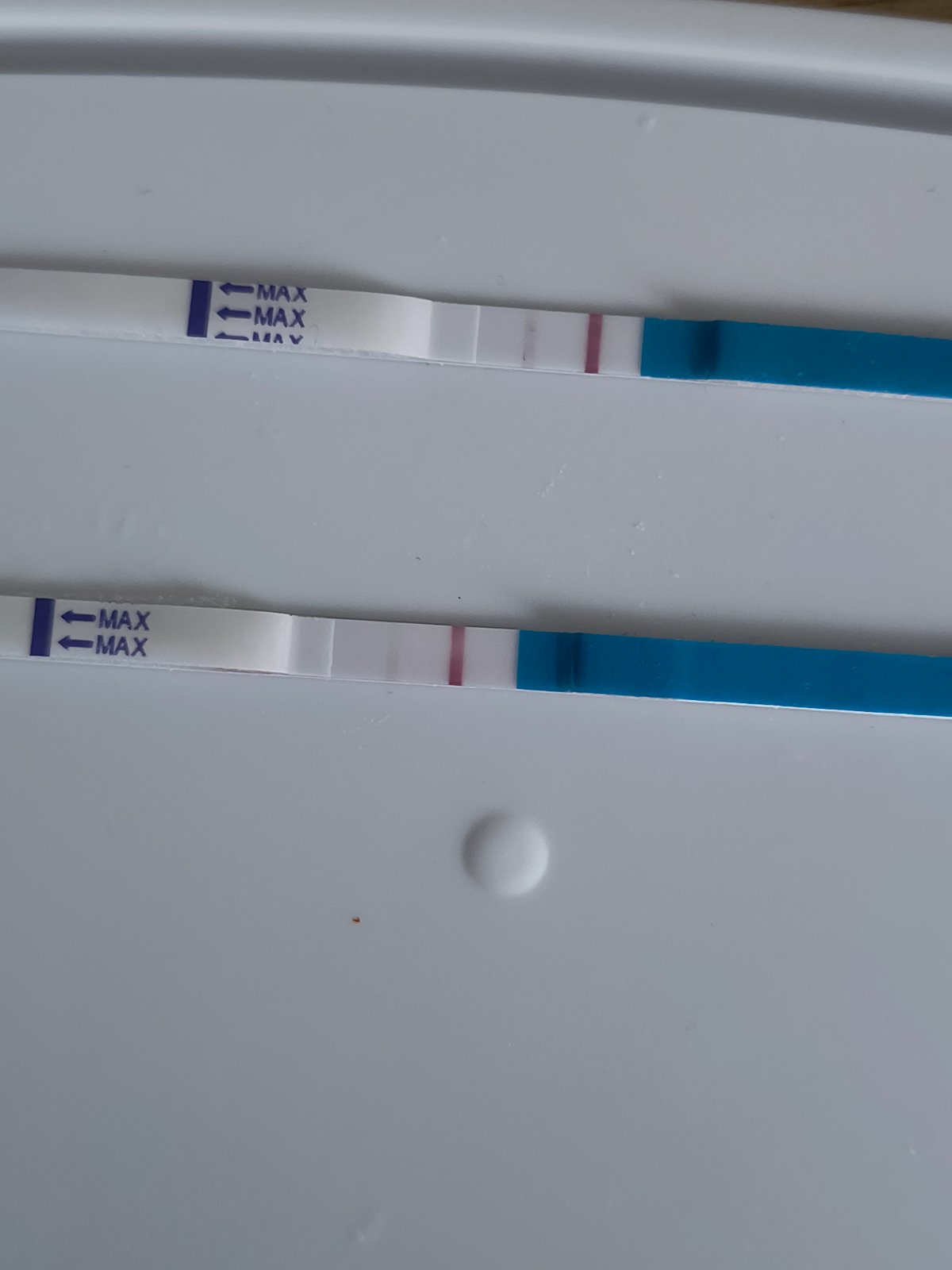 Ahojte, je mi dnes strašne blbo , teraz som si spravila test resp dva s rozdielom cca 10 min z dvoch rôznych balení. Pred dvoma mesiacmi som sekla meraním teploty, lebo mi to už udierali na mozog. A teraz toto podľa kalendára 6 dní do ms (22 deň cyklu). Horný je prvý, a spodný robený z ďalšieho moču max do 10 min